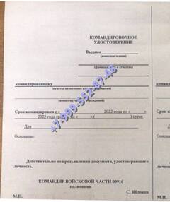 Документ может заполняться начальниками других частей, а также уполномоченными лицами. Если нет командировочного, суточные и иные выплаты не будут начисляться. Срок поездки четко обозначен приказом Министерства обороны. Он может изменяться в связи со сложившимися обстоятельствами. Купить командировочное удостоверение военнослужащего при срочной необходимости можно в нашей компании.